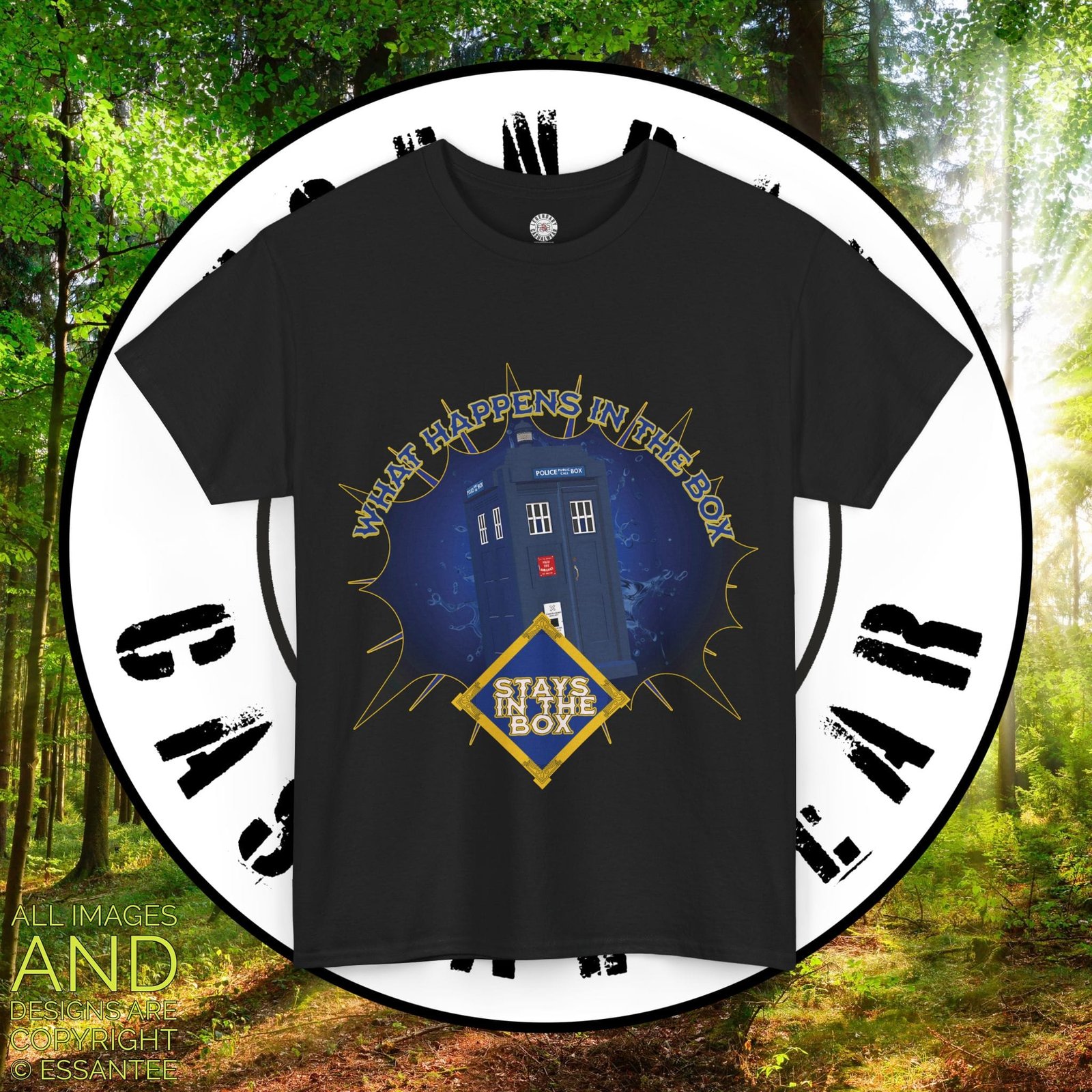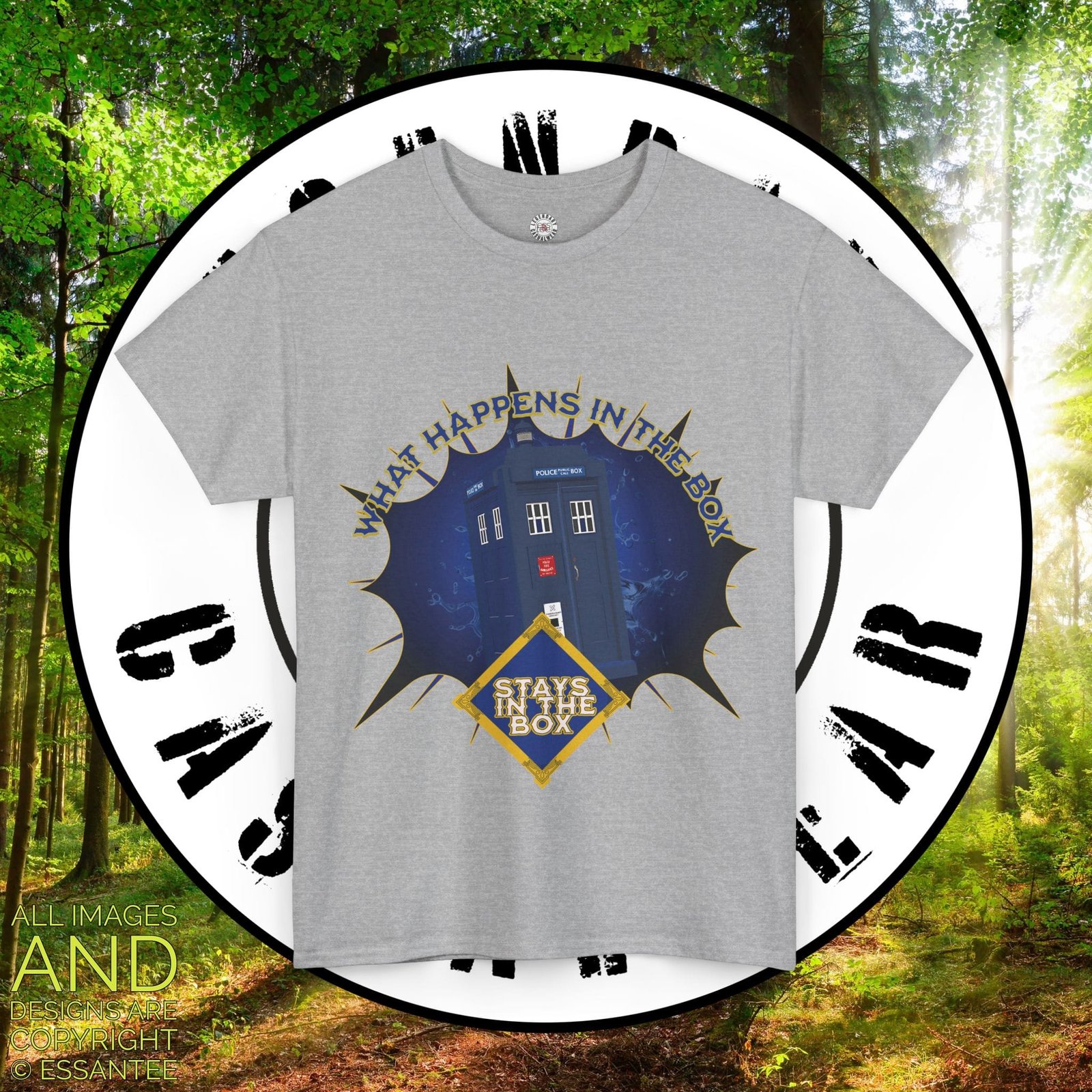 Nerdy Dr Who Quote Tee: “What Happens in the Box Stays in the Box” Unisex Heavy Cotton Tee, Fun Gift for Geeks, Casual Wear, Pop Culture Shirt. This tee exudes a fun and geeky vibe, perfect for casual everyday wear. Ideal for fans of Dr Who and pop culture enthusiasts. Relevant for birthdays, Comic-Con, and geeky themed events.